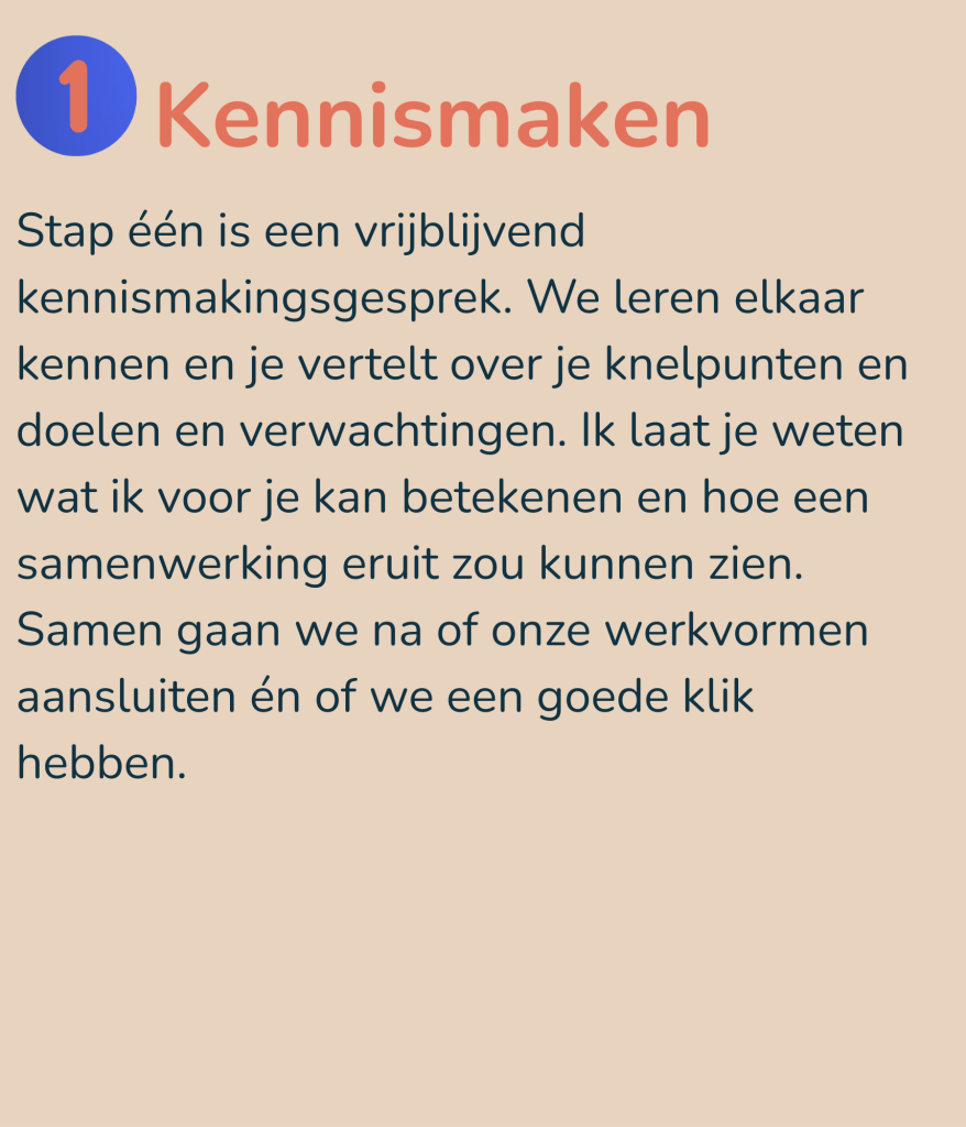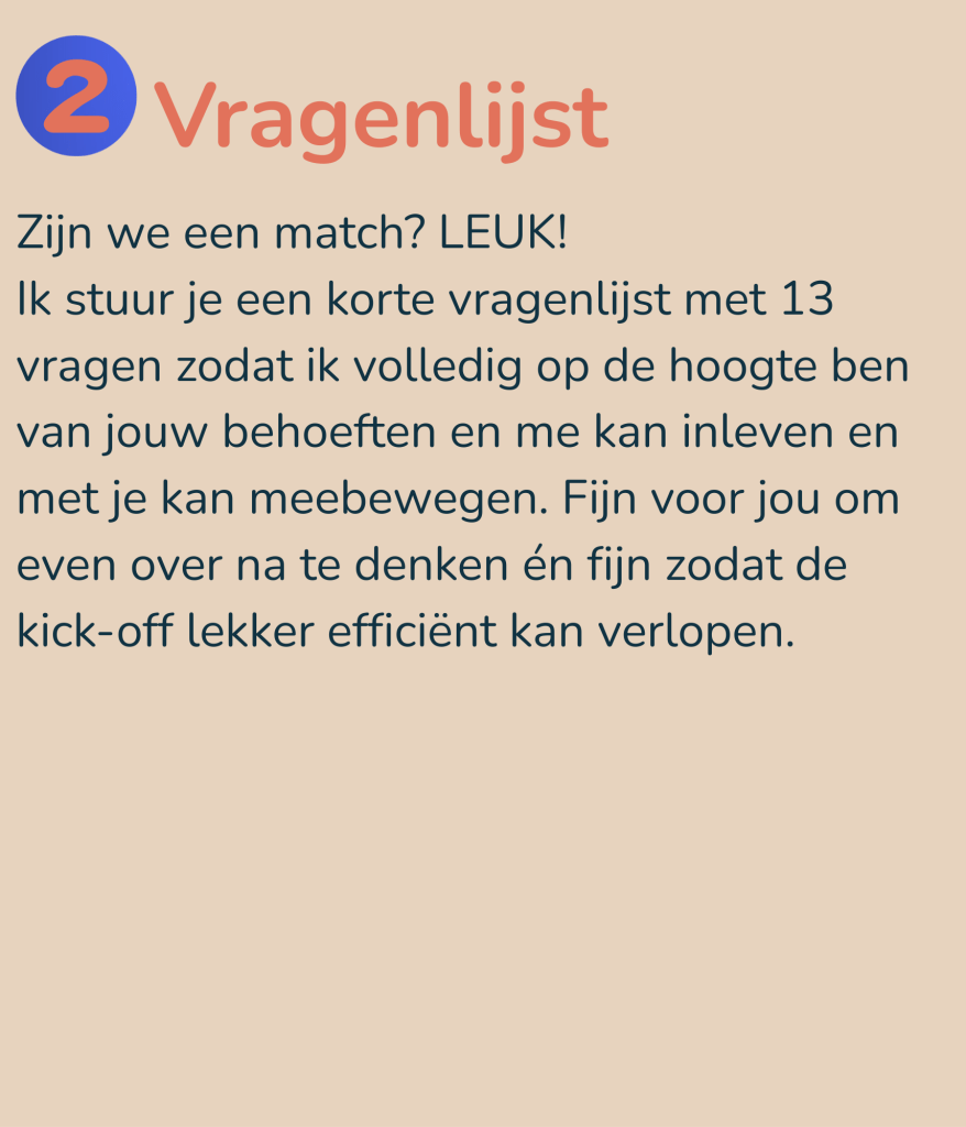 Benieuwd of er een samenwerking in kan zitten? Plan dan direct die kennismaking in. Niet schrikken nu! Ik zadel je niet direct op met een verkooppraatje óf een traject van duizenden euro’s. Eerst maar eens even kijken of er een klik is en of onze verwachtingen een beetje bij elkaar aansluiten.