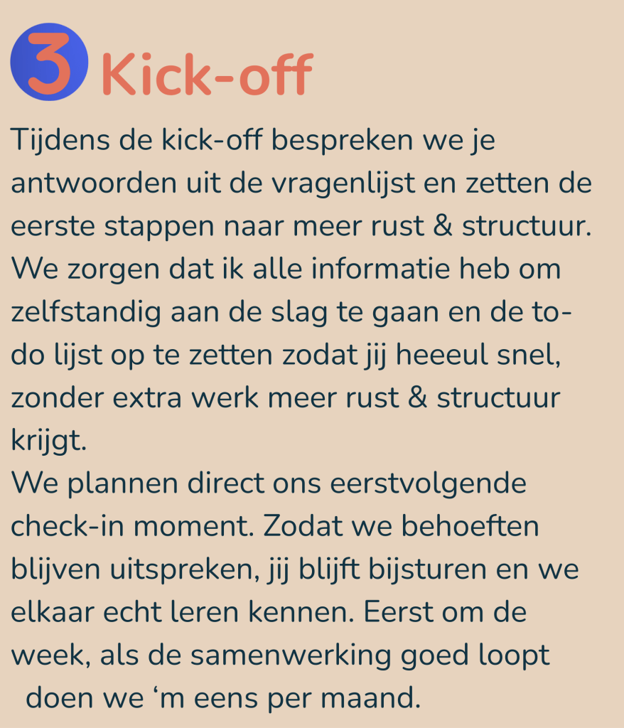 Zo kun jij meer tijd besteden om je business te laten groeien of om leuke dingen te doen! Binnen twee weken heb je een interactieve en overzichtelijke to-do lijst, waardoor je in één oogopslag je taken, deadlines en prioriteiten ziet. Daarna schuif ik to-do’s naar mijn lijstje zodat jij er niet meer naar om hoeft te kijken.