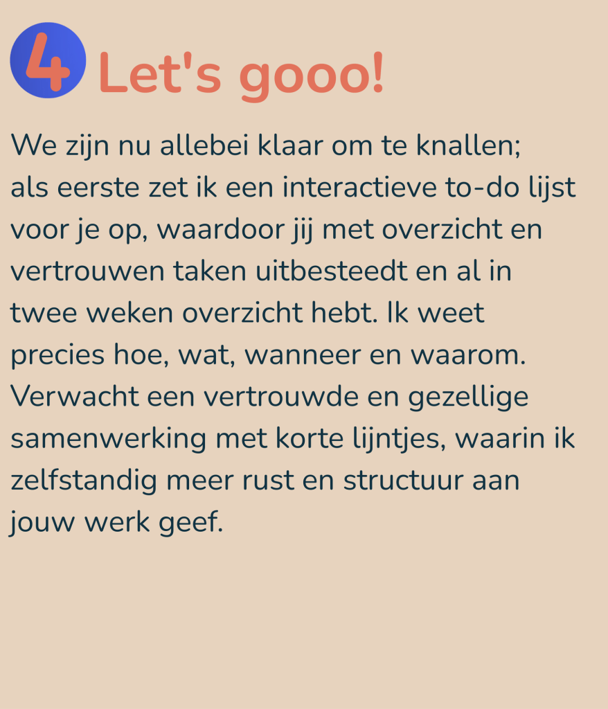 Werken als Virtual Assistant betekent voor mij anderen helpen om rust in hun koppie te krijgen. Geen vraag is te gek en geen meeting is me te veel. In de eerste twee weken van onze samenwerking voel jij al rust door een volledig dashboard in Notion waarop al je to-do’s makkelijk te vinden zijn. Nog meer rust én extra tijd nodig? Dan neem ik ook een aantal to-do’s van je over. Of die to-do’s nou gaan over het oppakken van klantcontact, het schrijven van een social media post, het verbeteren van je website of het organiseren van je administratie. I got you! Zodat jij al binnen twee weken meer rust ervaart én meer tijd hebt. Naast onze vaste incheckmomenten sta ik via WhatsApp of een belletje altijd voor je klaar als het zweet je toch nog een keer uitbreekt.Zo heb jij heel snel meer rust, tijd en ruimte om je bedrijf verder te laten groeien óf om een paar uurtjes in de week extra te chillen!